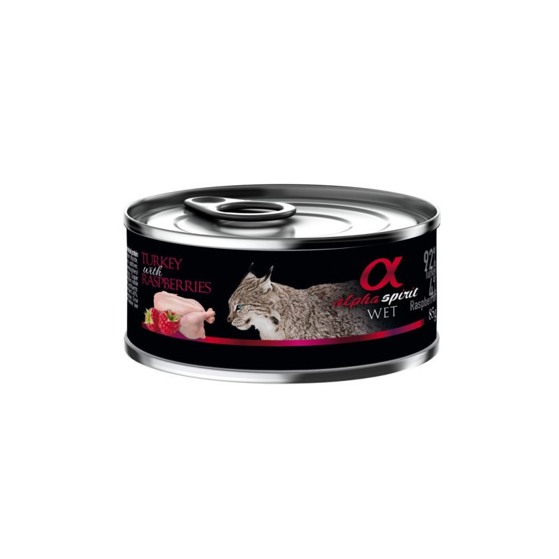 Alimento húmedo natural para gatos Alpha Spirit en lata. La comida húmeda Alpha Spirit para gatos ofrece a tu felino un alimento completo y de la más alta calidad para cuidar su salud. Una fórmula única, con un 92% de carne y un 4% de fruta fresca, que excluye los cereales y utiliza una única proteína animal. La mejor manera de evitar las intolerancias y alergias a los ingredientes y de conseguir una buena digestión.
