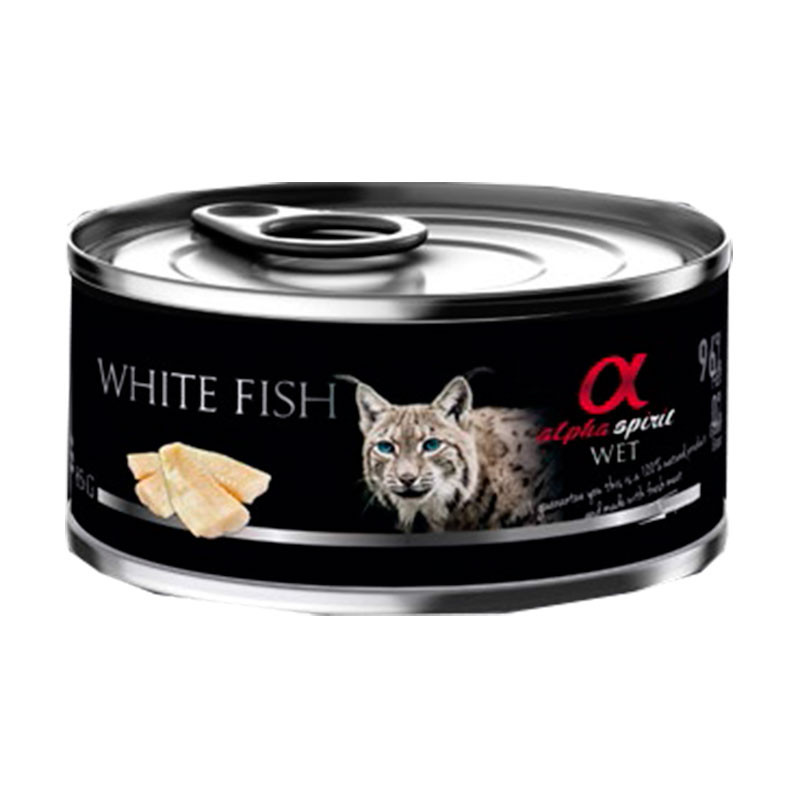 Alimento húmedo Alpha Spirit con un 96% de pescado blanco. La comida húmeda Alpha Spirit para gatos es un alimento completo y de primera calidad que ofrece una nutrición óptima. Todas las recetas “Only protein” utilizan un único tipo de carne o pescado y, por lo tanto, una única proteína de origen animal, con un increíble porcentaje del 96%. Una lata con mucha mucha carne para satisfacer el instinto salvaje de los felinos.