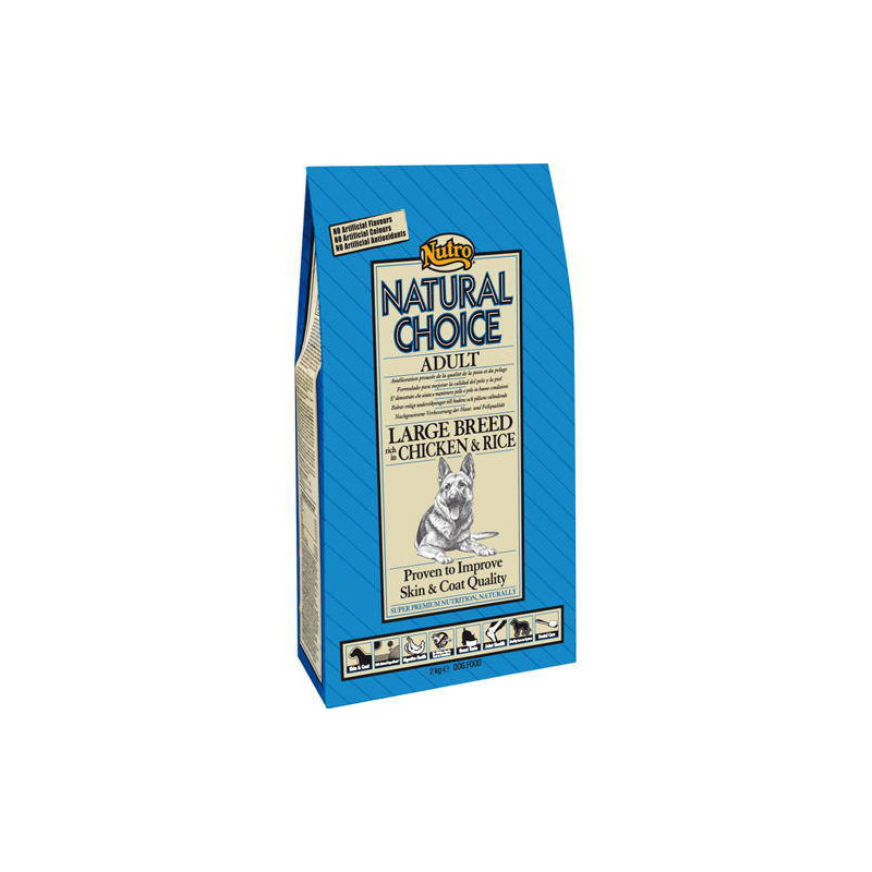 Comida para perros de razas grandes Nutro Natural Choice Adult Large BreedPienso completo y equilibrado especialmente indicado para el mantenimiento físico y muscular óptimo de los perros adultos de razas grandes (más de 25 kg), con actividad normal. Nutro Natural Choice Adult Large Breed ha sido diseñado para satisfacer todas las necesidades de estos perros ya que proporciona abundantes cantidades de proteína de pollo para el mantenimiento de sus músculos y ligamentos.Al saber que los animales de razas grandes tienen una necesidad menor de calcio y fósforo este pienso ha sido cuidadosamente formulado con el equilibrio ideal de estos minerales esenciales. Además, contiene además ácido linoleico para ayudar a mantener una piel y pelaje saludables y hermosos. Mientras que la glucosamina y el sulfato de condroitina favorecen el mantenimiento de las articulaciones. Y, por otro lado, los niveles de grasa están controlados evitando así una ganancia de peso excesiva o la obesidad de estos perros.VENTAJAS:Pienso completo y equilibrado para perros adultos de razas grandes.Con gran cantidad de proteína de pollo.Mantenimiento físico y muscular.Evita una ganancia de peso.La piel y el pelaje están saludables.USO Y ESPECIFICACIONES:Pienso completo y equilibrado de excelente calidad especialmente indicado para perros adultos de razas grandes para un óptimo mantenimiento físico y muscular y una piel y pelaje saludables.Descripción nutricional:Ingredientes: carne de pollo deshidratada (mín. 20%), arroz (14%), trigo integral, proteína de maíz, harina de trigo, grasa de ave (7%), pulpa de remolacha deshidratada, cloruro sódico, fibras vegetales, cloruro potásico, aceite de girasol, fosfato dicálcico, aceite de pescado (0.3%), alga marina deshidratada, extracto de romero.Constituyentes analíticos: proteínas (27%), grasas (14%), materia inorgánica (7%), fibras brutas (2%), calcio (1.1%), fósforo (0.85%), ácidos grasos omega 6 (2.5%).Aditivos nutricionales (por kg): vitamina A (20800 UI), vitamina D3 (1675 UI), vitamina E (alfa-tocoferol) (685 mg), vitamina C (300 mg), biotina (3.9 mg), vitamina B2 (60 mg), vitamina B3 (360 mg), vitamina B5 (90 mg), vitamina B6 (60 mg), taurina (1910 mg), sulfato cúprico pentahidratado (40 mg), yodato de potasio (2.8 mg), sulfato de manganeso monohidratado (180 mg), selenito de sodio (1.2 mg), sulfato de zinc monohidratado (535 mg).Recomendaciones de uso:Sirve el alimento seco o ligeramente humedecido a diario guiándote por la tabla de la ración diaria recomendada.Es recomendable que fracciones la ración en 2 comidas.Deja siempre agua limpia y fresca a disposición del animal.Siempre que se haga un cambio de alimentación, deja un tiempo en medio para evitar problemas digestivos.Dosificación:Cada animal tiene unas características propias por eso debes adaptarte a las de tu mascota con ayuda de esta tabla de ración diaria recomendada. Las cantidades son orientativas y dependen de la edad del animal, la actividad, la temperatura ambiental, etc. Peso adultoPoco activoActivoMuy activo25 kg270 g330 g375 g30 kg310 g375 g430 g35 kg345 g425 g480 g40 kg380 g470 g530 g45 kg420 g510 g580 g60 kg520 g635 g720 g80 kg645 g785 g895 gTamaño/formato:Disponible en sacos de 12 kg. Nutro Natural Choice Adult Large Breed es un pienso completo y equilibrado de excelente calidad para que tu perro se sienta más fuerte sin que gane un peso excesivo.Consulta nuestra gama de productos de Nutro EAN: 79105202619, 5998749118146, 2000000005973, 5998749118160