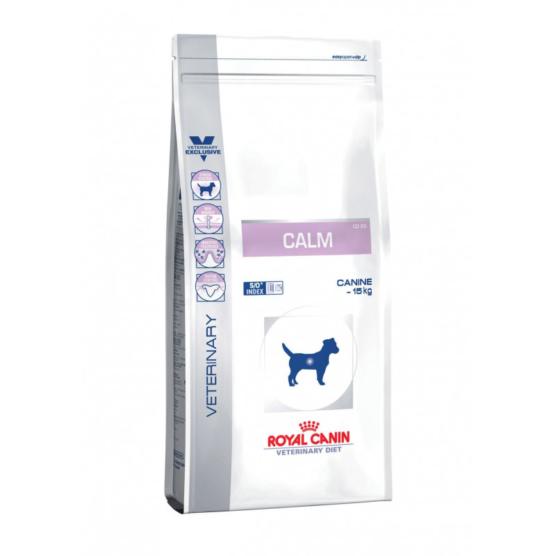 Pienso para perros con trastornos digestivos y cutáneos relacionados con el estrés Royal Canin Calm es un alimento destinado a los perros adultos de hasta 15 kg que combate los trastornos digestivos y cutáneos que aparecen en situaciones de estrés como: un viaje, una mudanza o la llegada de un niño, formulado con un péptido activo con efectos relajantes. Con este producto, Royal Canin Calm constituye una terapia complementaria al tratamiento de los trastornos ocasionados por la ansiedad.