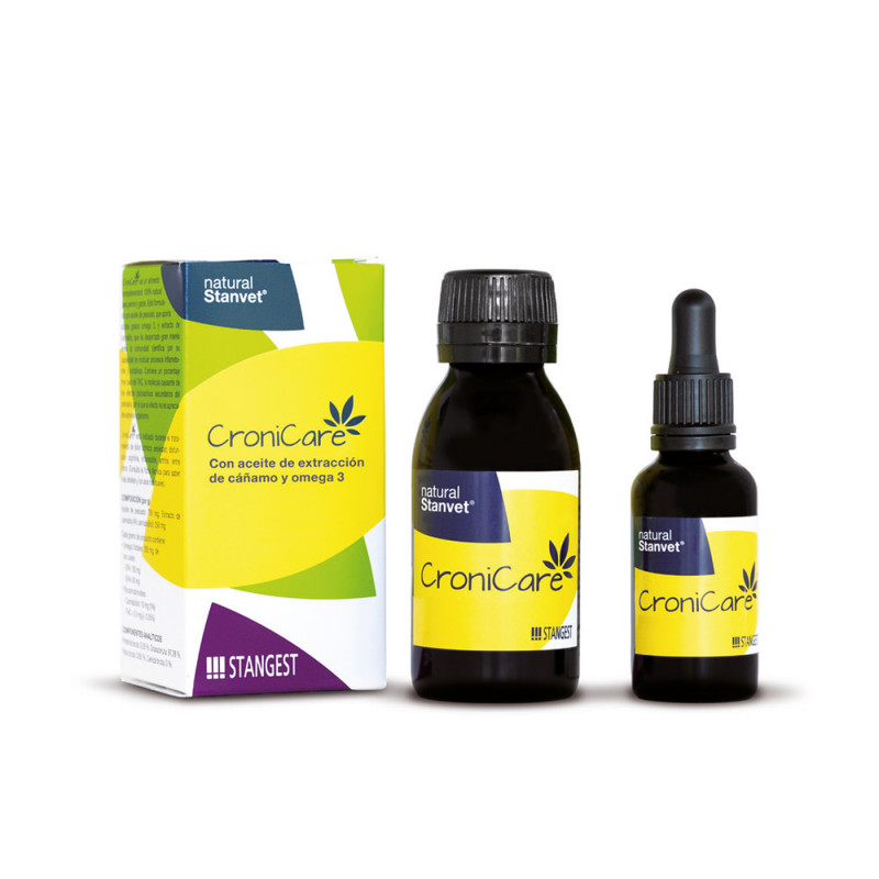 Alimento complementario para perros y gatos, formulado con una mezcla de aceite de extracción de cáñamo, omega 3 y triglicéridos de cadena media. Es un suplemento nutricional que aporta nutrientes clave para las mascotas, como fitocannabinoides, ácidos grasos esenciales, proteínas y minerales, entre otros. CroniCare está fabricado con variedades de cáñamo de cultivo autorizado en la UE.